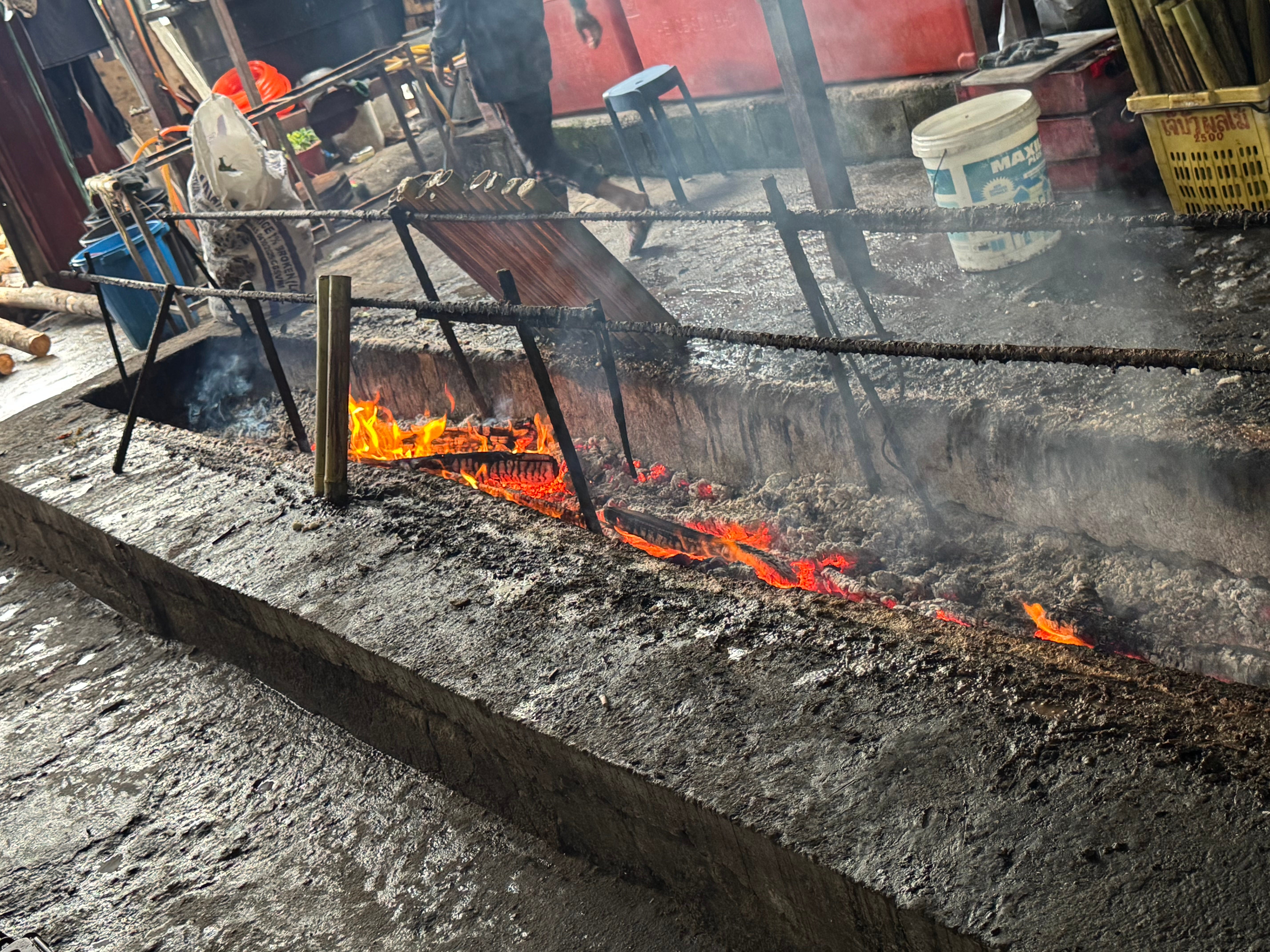 They were all conscious of my Jain vegetarianism -- no eggs, no meat, no fish. On the way, we stopped at a roadside stall making lemang, a traditional Malay dish in which rice mixed with coconut milk is packed into hollow bamboo sticks, lined with banana leaves, and slow-cooked over open flames.